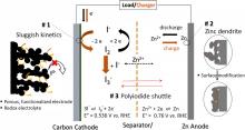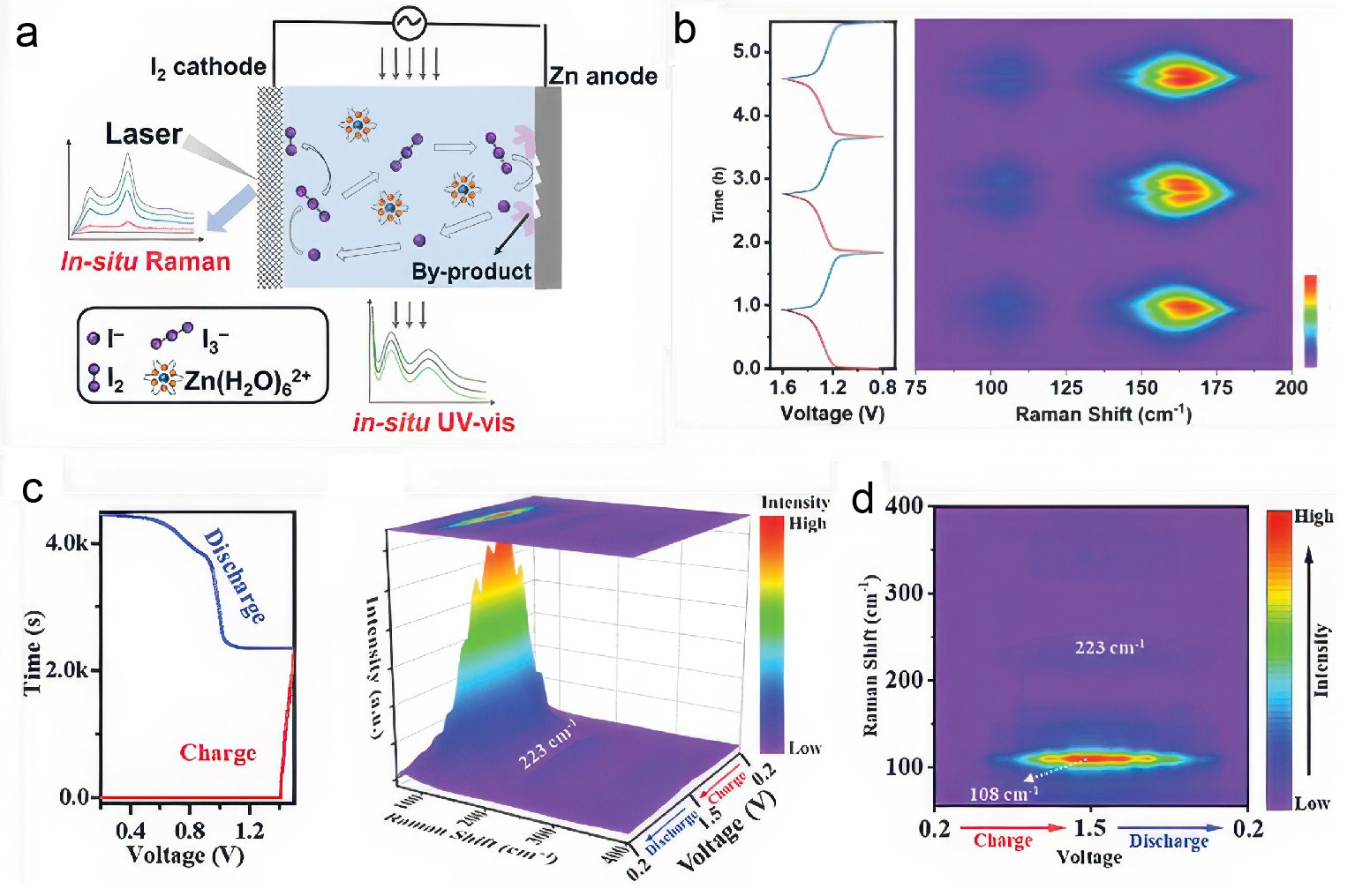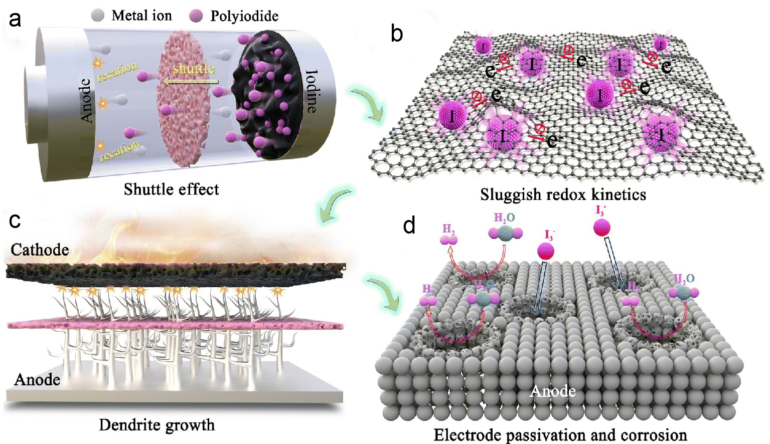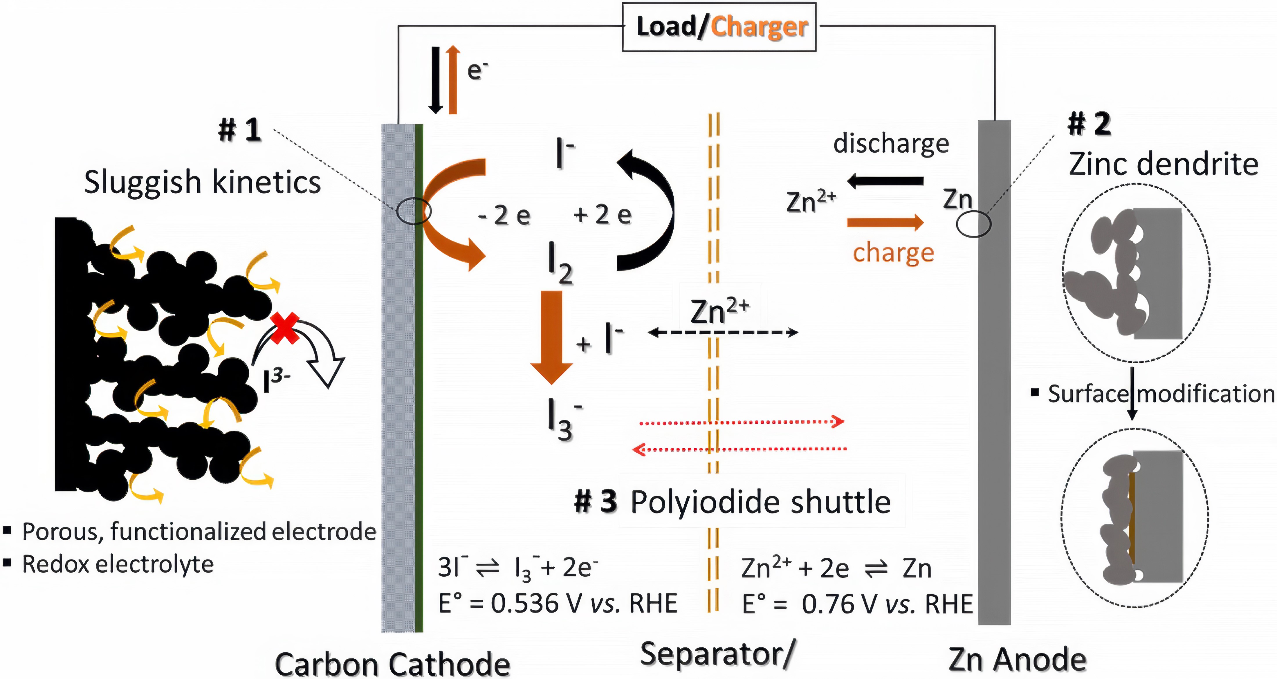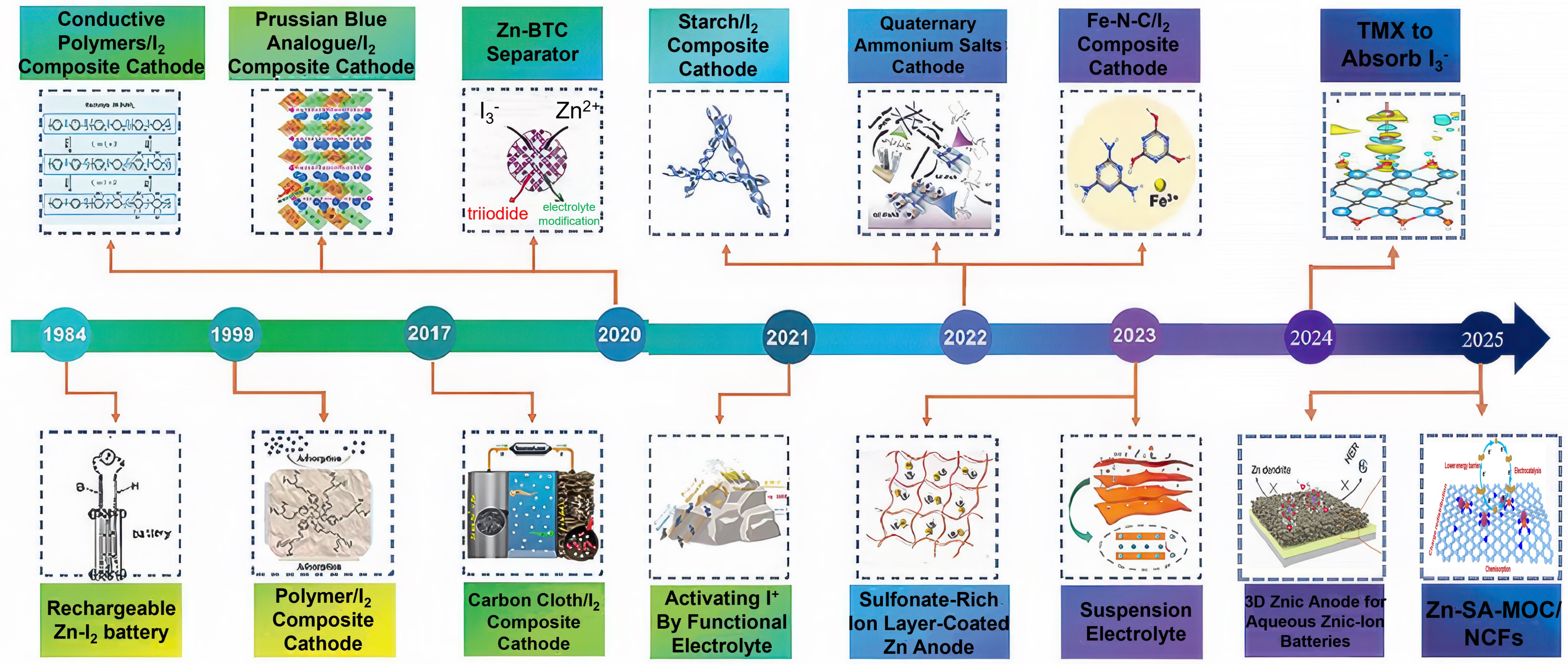 锌-碘(Zn-I2)电池因其高能量密度和环境友好性而备受关注,成为一种可持续的储能解决方案。本综述系统总结了Zn-I2电池在三个关键领域的最新研究进展:正极材料工程、锌负极稳定性调控和电解液设计。在正极方面,通过将碘锚定于导电基体上,可有效抑制多碘阴离子的穿梭效应,并加速I-/I2的氧化还原反应动力学。借助先进的原位表征技术,实现了对多碘中间体(I3-/I5-)的实时监测,深入揭示了电解质与电极间的相互作用,并为功能性添加剂的设计提供了理论依据,有效抑制了穿梭效应。在锌负极方面,近年来的创新手段如界面保护层的构建、三维导电骨架的引入及针对性的电解液添加剂的开发,在抑制锌枝晶生长和副反应方面取得了显著成效,从而提升了循环稳定性和库仑效率。然而,要在实际应用条件下实现长期可逆性和结构完整性仍面临诸多挑战。未来的研究应聚焦于协同电解液体系的构建和集成化电极结构的设计,以在化学稳定性、离子传输能力与机械强度之间实现协同优化,推动下一代Zn-I2电池技术的应用。特别是,开发具有协同增效作用的多功能电解质添加剂,以及构建兼顾力学强度与离子传输动力学的复合电极结构,将在提升Zn-I2电池性能和深化储能机理理解方面发挥关键作用。