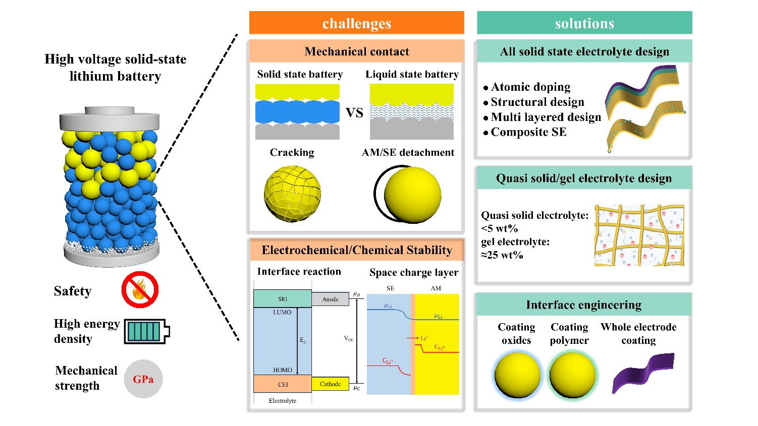 固态锂电池因其优异的安全性能而成为大规模储能领域的研究热点。与锂金属阳极匹配的高压正极材料的发展使固态锂电池的能量密度接近甚至超过了基于液体电解液的锂电池。然而,在高电压条件下(> 4.3 V),固态电解质组分分解、结构退化和界面副反应会显著降低高压固态电池性能,阻碍其进一步发展。本文综述了高压固态锂电池中无机电解质、聚合物电解质和复合电解质的最新研究进展。同时,详细介绍了高压凝胶固体电解质和高压准固体电解质的设计。此外,界面工程对于提高高压固态电池的整体性能至关重要。最后,我们总结了高压固态锂电池面临的挑战,并对未来的研究方向提出了自己的看法,以期对未来的研究具有指导意义,推动高压固态锂电池的发展。