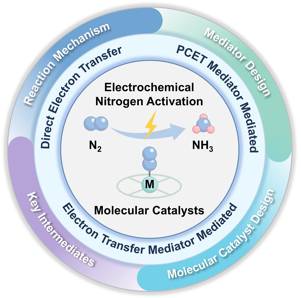 均相电催化氮气还原(NRR)可在温和条件下探索分子固氮路径,并通过调控金属中心、配体骨架与反应介质构建和优化催化体系,从而在分子层面捕获关键固氮中间体。然而,该领域仍受制于所需还原电势较负、析氢反应竞争强、可持续周转频率受限及长期稳定性不足等瓶颈。本综述以“电子如何递送至分子活性中心”为主线,对均相电化学氮气活化/转化体系进行分类:一类为直接电子传递(DET),电极将电子传递给可循环的介导体“mediator”,再由介导体在均相体系中传递给催化循环。介导体系进一步分为仅传递电子的电子转移(ET)介导体与实现质子–电子耦合递送的 PCET 介导体。在DET部分,我们梳理从早期低价Ti、W物种到近年来广泛研究的Mo、Fe、Re分子配合物的结构与反应过程中的关键中间体,并将机理归纳为两条主路径:其一为“cleavage-first”断键路径,通过N≡N裂解生成可分离/可表征的金属氮化物(M≡N);其二为“PCET-first”路径,在保持N–N键的前提下逐步氢化形成NxHy中间体并进一步生成氨。上述归纳为建立配体电子效应、二级配位层、多金属协同及溶剂/电解质微环境与选择性之间的构效关系提供参考。在介导部分,ET介导体可在一定程度上将强还原需求从催化剂本体“外移”,缓冲过强的还原环境并降低失活风险;PCET介导体则依托可调的氧化还原电位与介体–H键强度(BDFE),以更可控的方式进行电子/质子转移,从而促进中间体氢化并提升有效活性与周转数。最后,我们强调均相电催化氮气还原的研究仍需坚持严格的污染控制与定量产物鉴定标准,并指出有必要通过更合理的分子与体系层面设计提升催化反应在长时间运行下的稳定性。进一步地,我们展望了可将介导体策略、分子催化剂设计与电解槽工程相结合,推动均相体系由机理模型迈向具备规模化潜力的电化学合成氨器件。