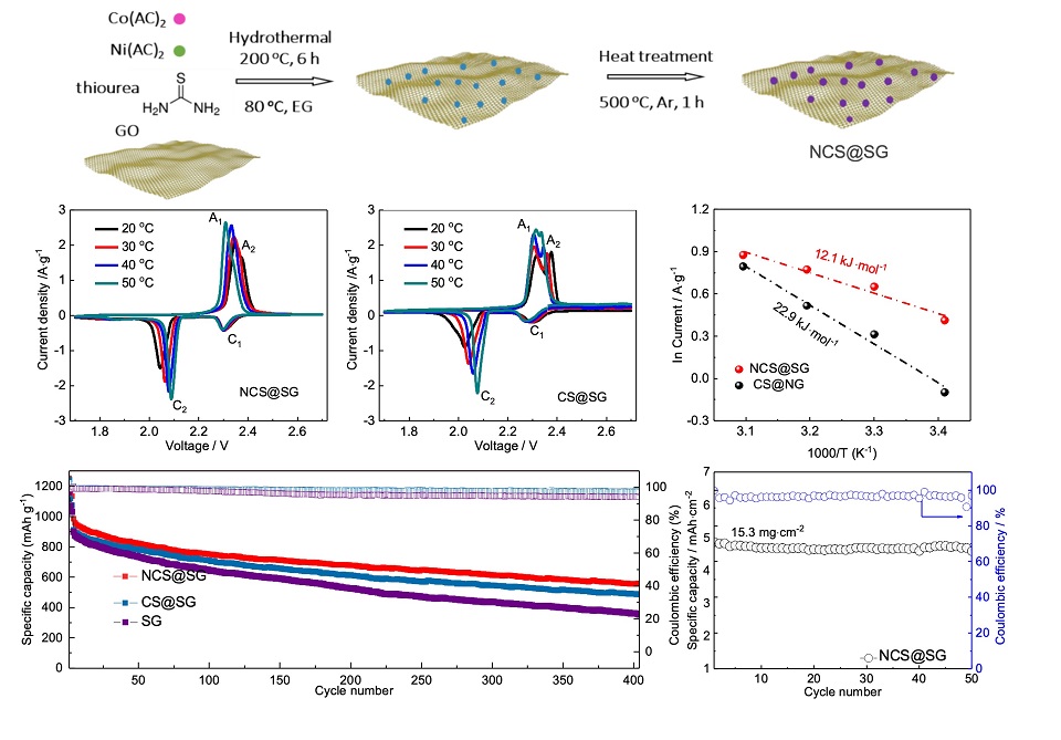 锂硫电池是极具应用潜力的下一代高能量密度电池体系之一。然而,其充放电中间产物多硫化锂的“穿梭效应”不仅消耗大量电解液,还导致硫活性物质利用率低、循环寿命短,是锂硫电池产业化进程中的主要瓶颈之一。引入催化剂加速硫活性物质转化速率,减少多硫化锂在电解液中的累积浓度,是抑制穿梭效应的有效解决策略。高效的催化剂应具备丰富的催化活性位点,以确保高效吸附多硫化锂并加速其向不溶的充放电产物转化。本文制备出硫掺杂石墨烯表面原位负载的双金属硫化物NiCo2S4(NCS@SG)并将其作为催化剂应用于锂硫电池的中间层。相比于单金属硫化物(CoS),NiCo2S4催化剂具有多活性中心催化位点,可以更好地吸附多硫化锂并促进其向放电产物快速转化。应用上述中间层后,电池的充放电比容量、库仑效率和循环稳定性得到了明显提升。当硫的负载达到15.3 mg·cm-2时,经过50次循环后,具有NCS@SG中间层的电池获得了高达93.9%的容量保持率。上述结果表明,设计双金属基催化剂是优化锂硫电池催化剂活性和反应效率的重要方向。