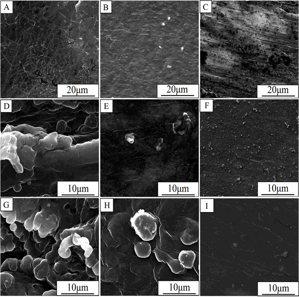 | Fig. 4 SEM images of Li metal (A), Li-Al alloy (B) and Li-B alloy (C) with no treatment; SEM images of Li metal (D), Li-Al alloy (E) and Li-B alloy (F) in electrolyte without polysulfides after 50 cycles; SEM images of Li metal (G), Li-Al alloy (H) and Li-B alloy (I) in electrolyte with polysulfides after 50 cycles[ |