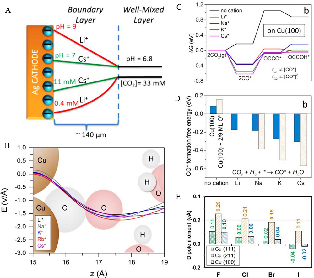 Fig. 2 (A) Alkali metal ions adjusting surface pH and local concentration of CO2 (Reprinted with permission from Ref.[32]. Copyright (2016) American Chemical Society). (B) Surface electric field induced by alkali metal ions in normal distribution (Reprinted with permission from Ref. [34]. Copyright (2017) American Chemical Society). (C), (D) Adsorption energy of CO2 reduction intermediates tailored by alkali metal ions (Reprinted with permission from Ref.[26]. Copyright (2018) American Chemical Society). (E) Specific adsorption of halides (Reprinted with permission from Ref.[36]. Copyright (2018) American Chemical Society).