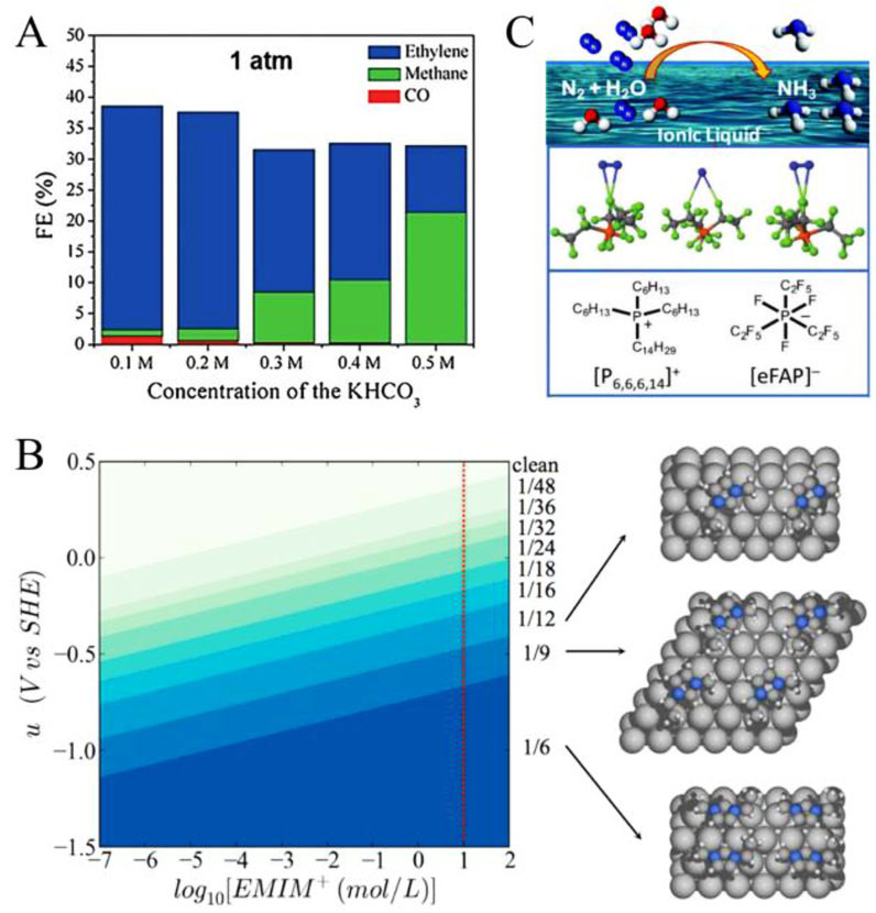Fig. 3 (A) Tailoring CO2 reduction selectivity by bicarbonate concentration (Reprinted with permission from Ref.[44]. Copyright (2015) Wiley-VCH Verlag GmbH & Co. KGaA). (B) Pourbaix diagrams of EMIM+ on Ag(111) surface (Reprinted with permission from Ref.[55]. Copyright (2015) American Chemical Society). (C) Ionic liquids used for N2 reduction (Reprinted with permission from Ref.[54]. Copyright (2017) Royal Society of Chemistry).