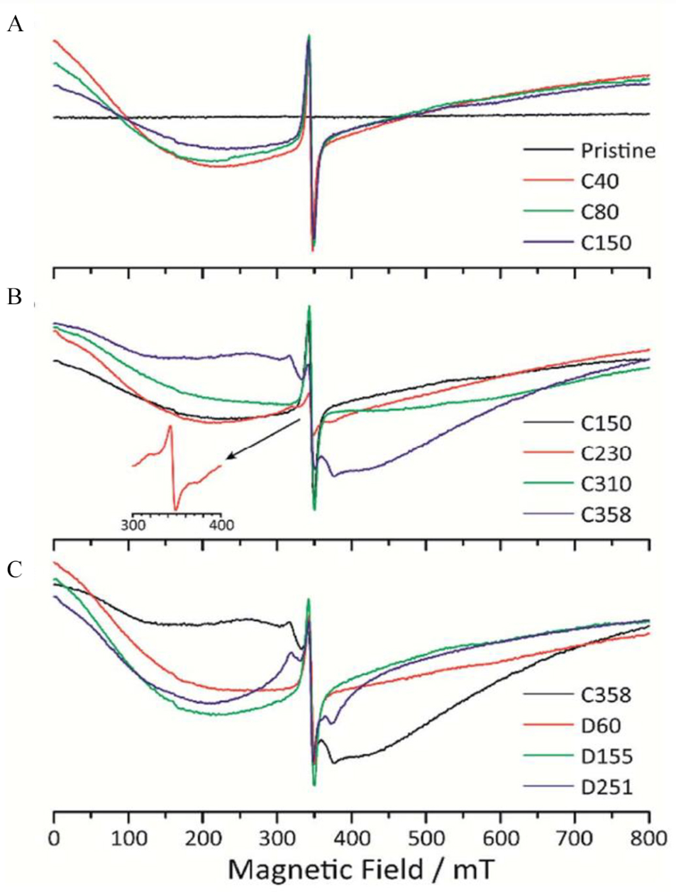 | Figure 10. Ex-situ perpendicular-mode CW-EPR spectra of LTMO during the processes of (A) Mn oxidation, (B) O oxidation, and (C) reduction. These EPR measurements were performed at 1.8 K. Signal intensities are normalized based on the mass of each material scraped from the electrodes. The sharp signals centered at ~ 345 mT (g ~ 2.0) stem from the delocalized electrons in the conductive carbon black, which can be regarded as an external reference although it may cover up similar signals. (Reproduced from Ref.[ |