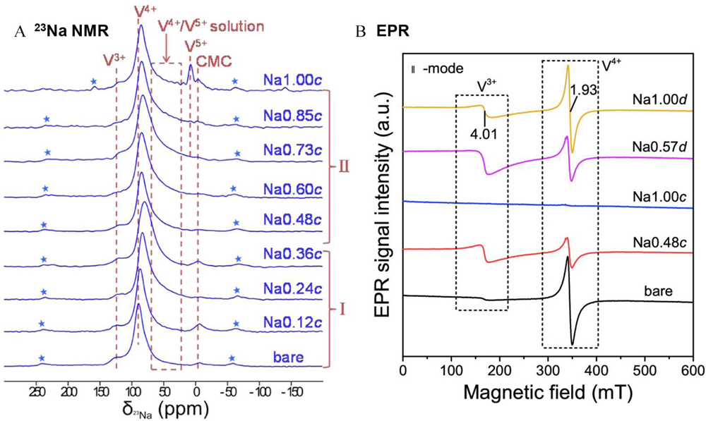 | Figure 7. (A) 23Na MAS ssNMR spectra of the NV3.8POF electrodes under various SOC (states-of-charge) values during charge process; (B) Parallel-mode EPR spectra of cycled NV3.8POF under representative SOC. (Reprinted with permission from ref.[ |