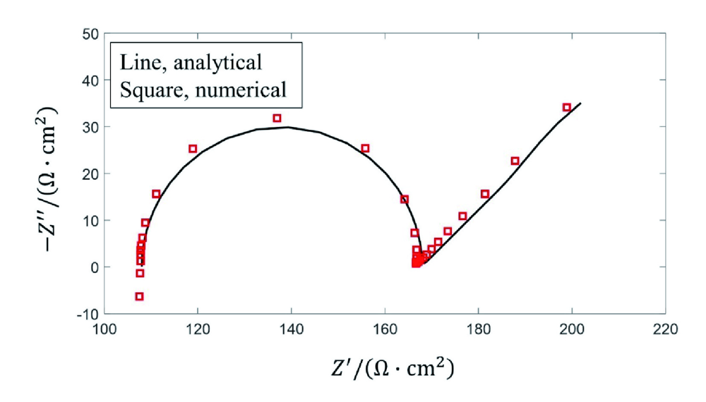 | Figure 12. Comparison between the AFT-calculated and the analytical impedance expressed in Eq. (127). Parameters used in calculation are as follows, c0 = 100 mol·m-3, k0 = 4.45× 10-5 mol·m-2·s-1, D = 3.2×10-11 m2·s-1, frequency range: 4.22×10-4 ~ 5×105 Hz, sampling frequency: 100*(excitation frequency), sampling duration: the reciprocal of sampling frequency. Matlab script of this model is provided in the supporting information. |