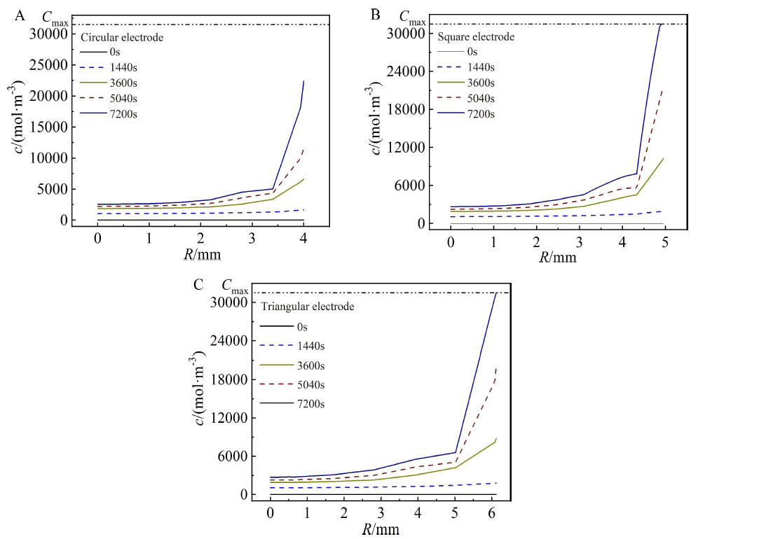 | 图9 电极锂浓度随时间演化图(A-C)路径4、5、6。 |
