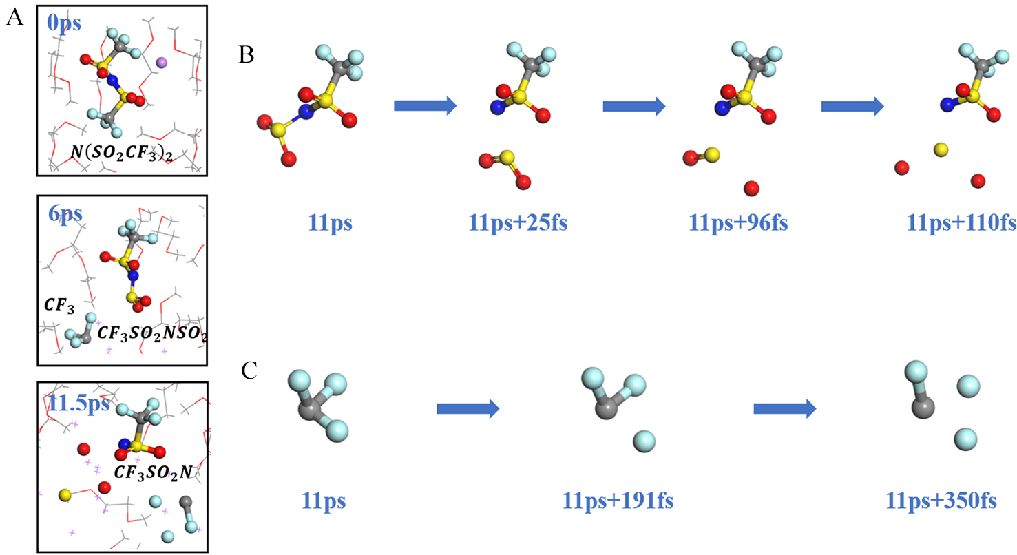 | 图2 (A) DME/LiTFSI混合物经HAIR模拟在0 ~ 11.5 ps内得到的TFSI分解过程;(B) CF3SO2NSO2在10 ps ~ 11.5 ps内的分解过程;(C) CF3在10 ps ~ 11.5 ps内的分解过程。其中紫色代表锂,红色代表氧,黄色代表硫,灰色代表碳,青色代表氟,蓝色代表氮,白色代表氢。(网络版彩图) |