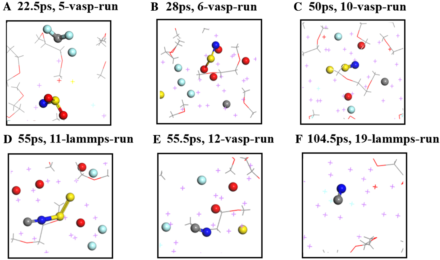 | Figure 3 Sequence of CF3SO2N decompositions obtained from HAIR simulations between 22.5 and 104.5 ps. (A) 22.5 ps. (B) 28 ps. (C) 50 ps. (D) 55 ps. (E) 55.5 ps. (F) 104.5 ps. Color code: lithium, purple;oxygen, red; sulfur, yellow; carbon, gray; fluorine, cyan; nitrogen, blue; hydrogen, white. (color on line) |