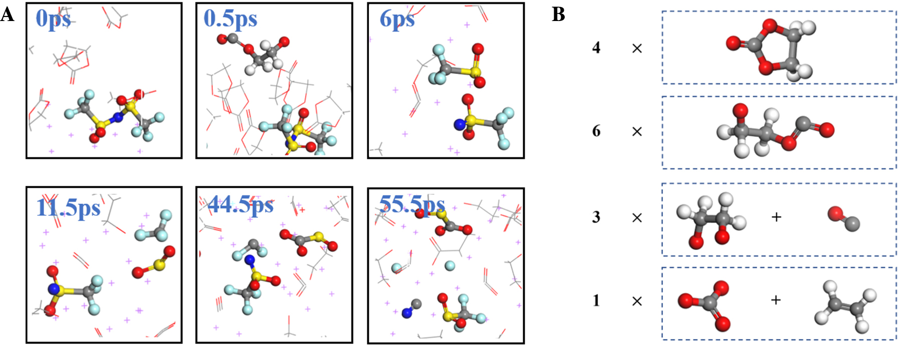 | 图5 (A)EC/LiTFSI混合物在0-55.5 ps内的分解过程;(B)14个EC溶剂分子在5.5 ps时的状态;其中紫色代表锂,红色代表氧,黄色代表硫,灰色代表碳,青色代表氟,蓝色代表氮,白色代表氢。 |
