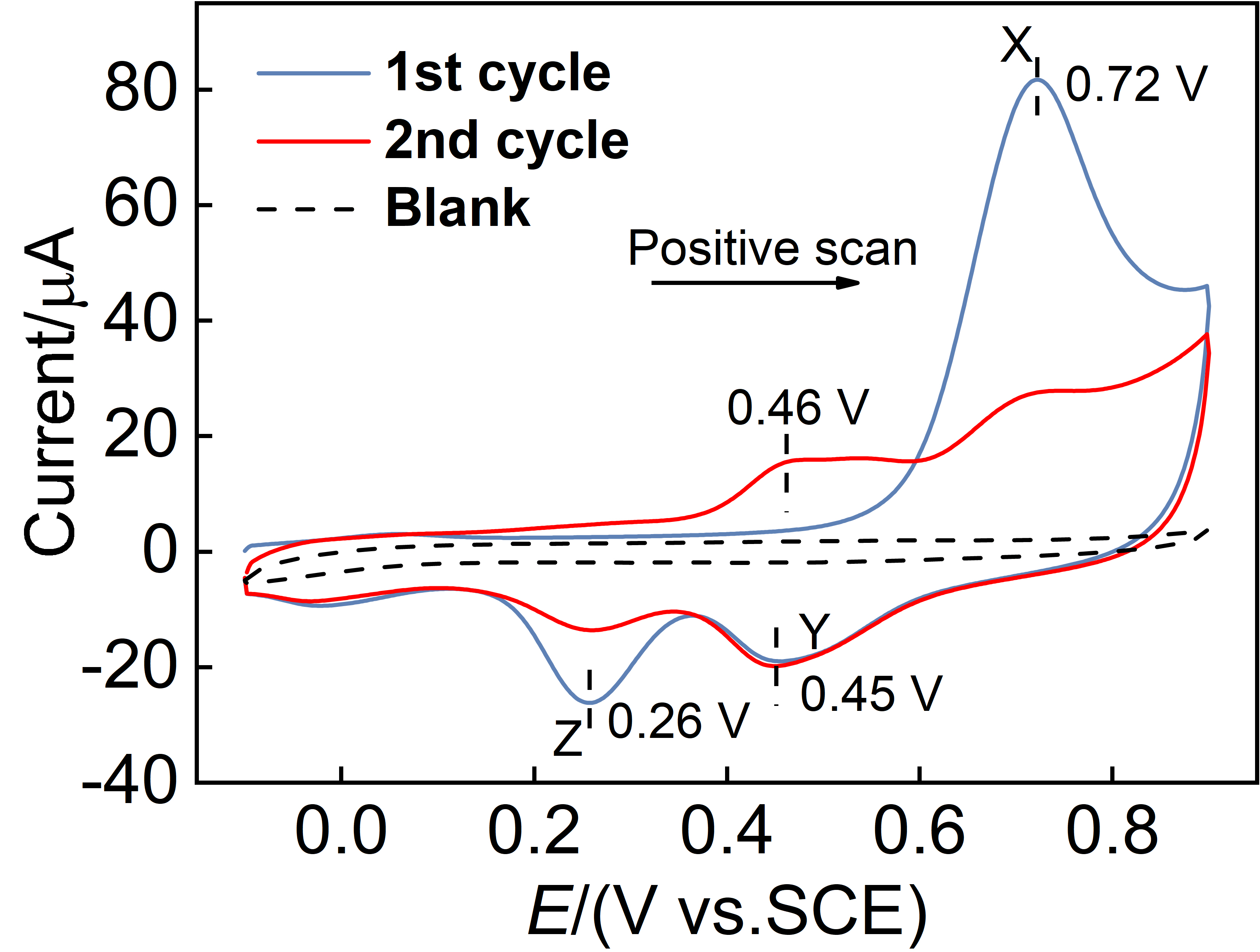 | Figure 1 Electrochemical CV curves of electrode surface in 0.05 mol·L-1 H2SO4 electrolyte (pH = 1). (color on line) |