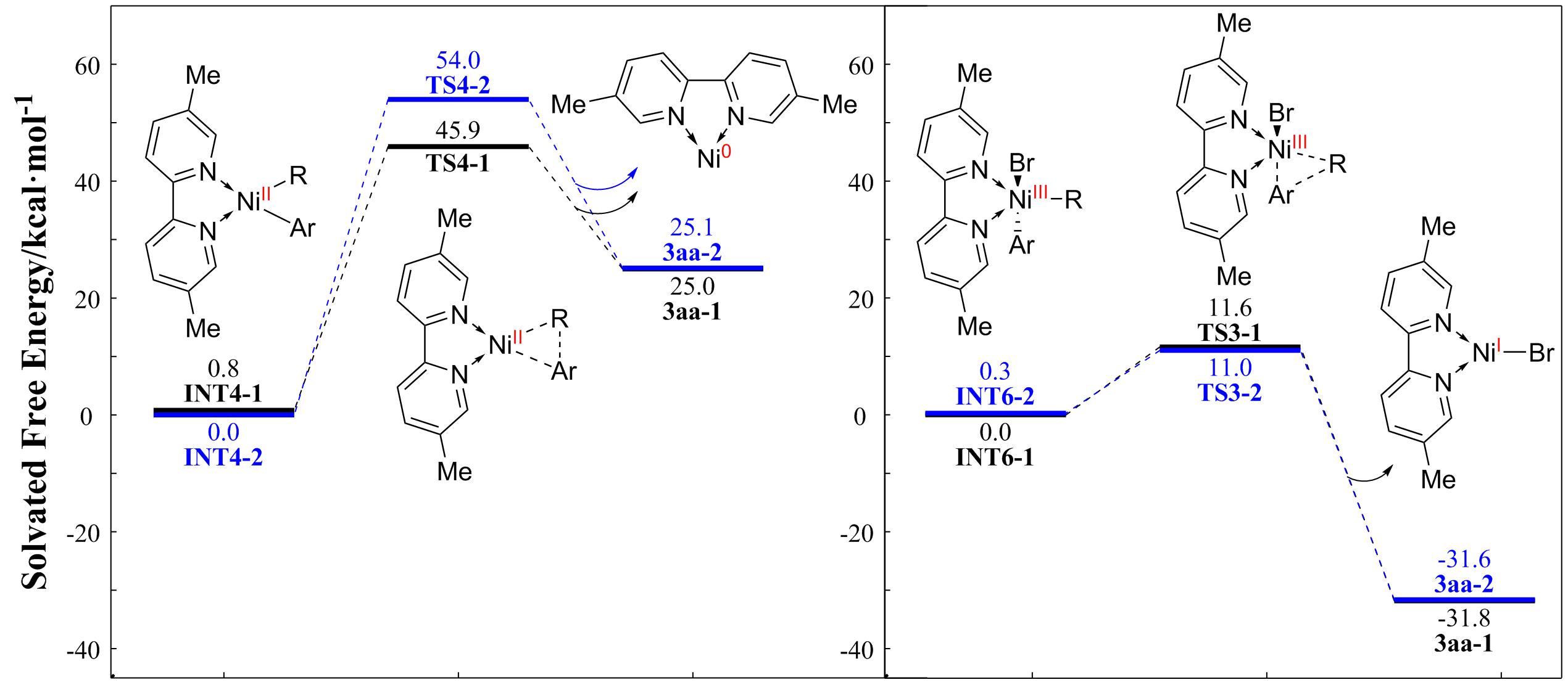 | Figure 10. Energy barriers of reductive eliminations from divalent Ni species (left) and trivalent Ni species (right) at PBE0-D3(BJ)/def2-TZVP-SMD(DMAc)//PBE0-D3(BJ)/def2-SVP-SMD(DMAc). |