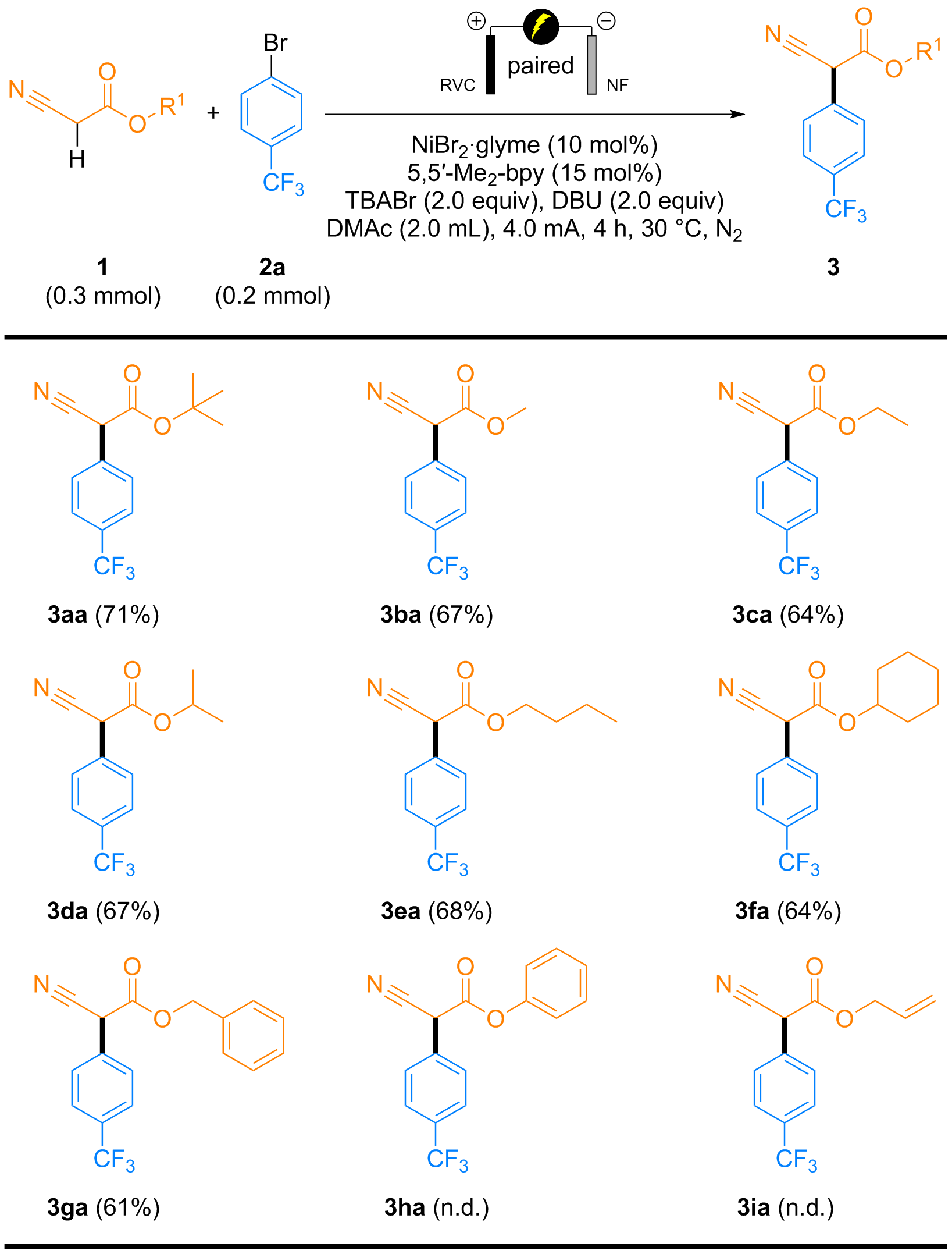 电化学促进的镍催化的α-氰基乙酸酯的α-芳基化反应