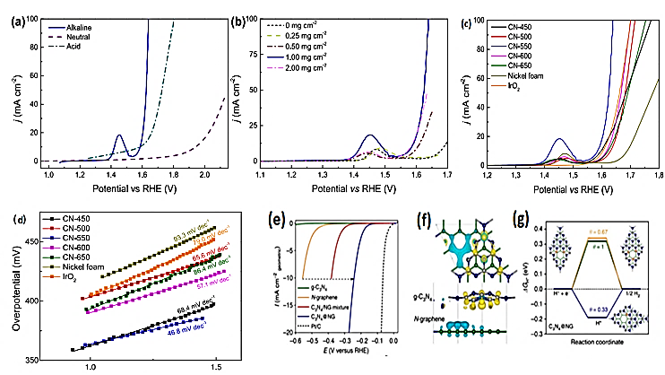 | Figure 8. Anodic polarization curves using CN-550 (a). under different pH (with a catalyst load of 1.00 mg·cm−2) and (b). various loadings onto the nickel foam (alkaline media), (c). Anodic polarization curves of the prepared catalysts and (d). corresponding Tafel slopes, (e). LSV curves of g-C3N4, N-graphene, C3N4 @NG, C3N4 @NG mixture and commercial Pt/C, (f). Interfacial electron transfer in C3N4@NG. Yellow and cyan iso-surface represents electron accumulation and electron depletion and (g). Free-energy diagram of HER on the surface of C3N4 @NG under different H* coverages (insets: 1/3, 2/3, and 1 with the molecular configurations). Reproduced from [ |