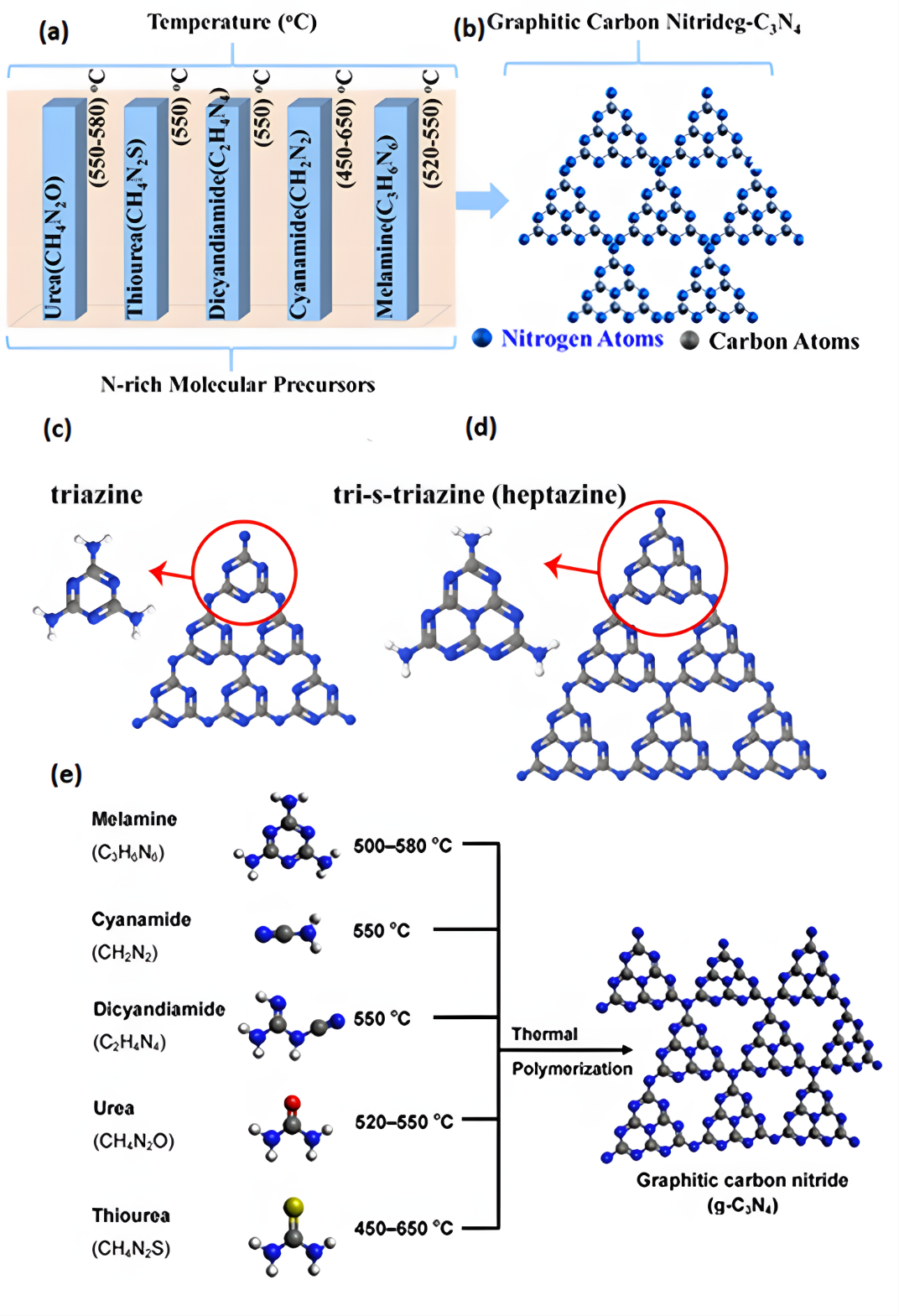 | Figure 1. (a, b). Nitrogen rich molecular precursor with synthesis thermal polymerization temperatures for synthesis of g-C3N4, (c). triazine and (d). tri-s-triazine (heptazine) structures of g-C3N4 and (e). schematic illustration of the synthesis process of g-C3N4 by thermal polymerization of different precursors such as melamine [ |
