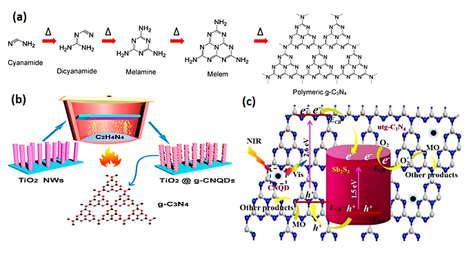 | Figure 2. (a). Reaction pathway for the development of g-C3N4 using cyanamide as the precursor, (b). Scheme showing a process of obtaining TiO2@g-CNQDs and (c). Proposed mechanism for the MO degradation on the CNS composites under NIR irradiation. Reproduced with the permission of Elsevier. |