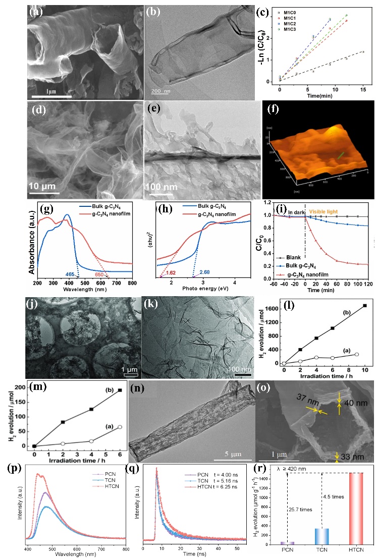 | Figure. 5. (a). SEM and (b). TEM images of M1C2 with (c). RhB photodegradation kinetics, (d). SEM, (e). HRTEM and (f). AFM images of ultrathin porous g-C3N4 nanofilm with (g). UV-Vis absorption spectra, (h). bandgap values and (i). TC photodeterioration with bulk g-C3N4 and ultrathin porous g-C3N4 nanofilm, (j). High magnification SEM of g-C3N4, (k). Low magnification TEM of g-C3N4. Hydrogen evolution with bulk g-C3N4 and g-C3N4 nanosheets under (l). UV-Vis light and (m). visible light, (n). SEM of HTCN, (o). TEM of HTCN, (p). Steady-state PL spectra, (q). Time resolved PL spectra and (r). Hydrogen evolution polts of PCN, TCN and HTCN. Reproduced from [ |