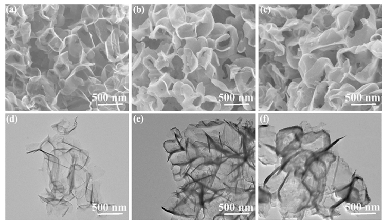 | Fig. 5. SEM images of (a) NCNs, (b) AlN@NCNs, and (c) AlN@NCNs/S. TEM images of (d) NCNs, (e) AlN@NCNs, and (f) AlN@NCNs/S. Reprinted with permission of Ref. [ |