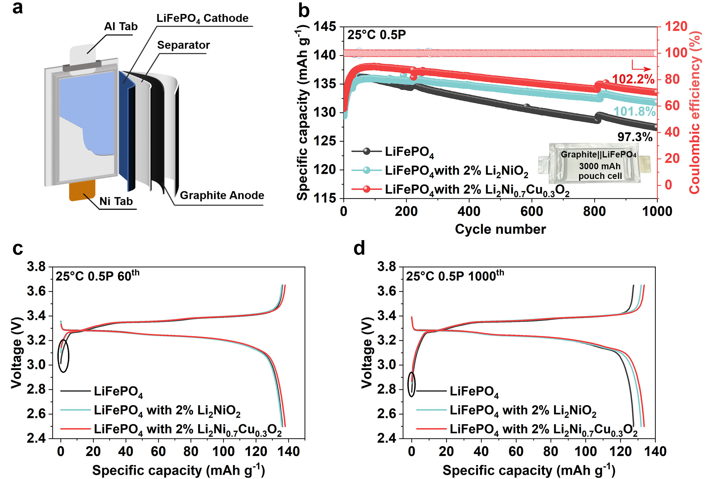 | Fig. 4. (a) Schematic illustration of a graphite‖LiFePO4 pouch cell with a nominal capacity of 3000 mAh assembled by the prototype line of Xiamen Hithium Energy Storage Technology Co., Ltd. LiFePO4 pouch cell. (b) Cycling performance curves of pouch cell with Li2NiO2 and Li2Ni0.7Cu0.3O2 prelithiation additives. (c) The 60th and (d) 1000th charge/discharge curves. |
