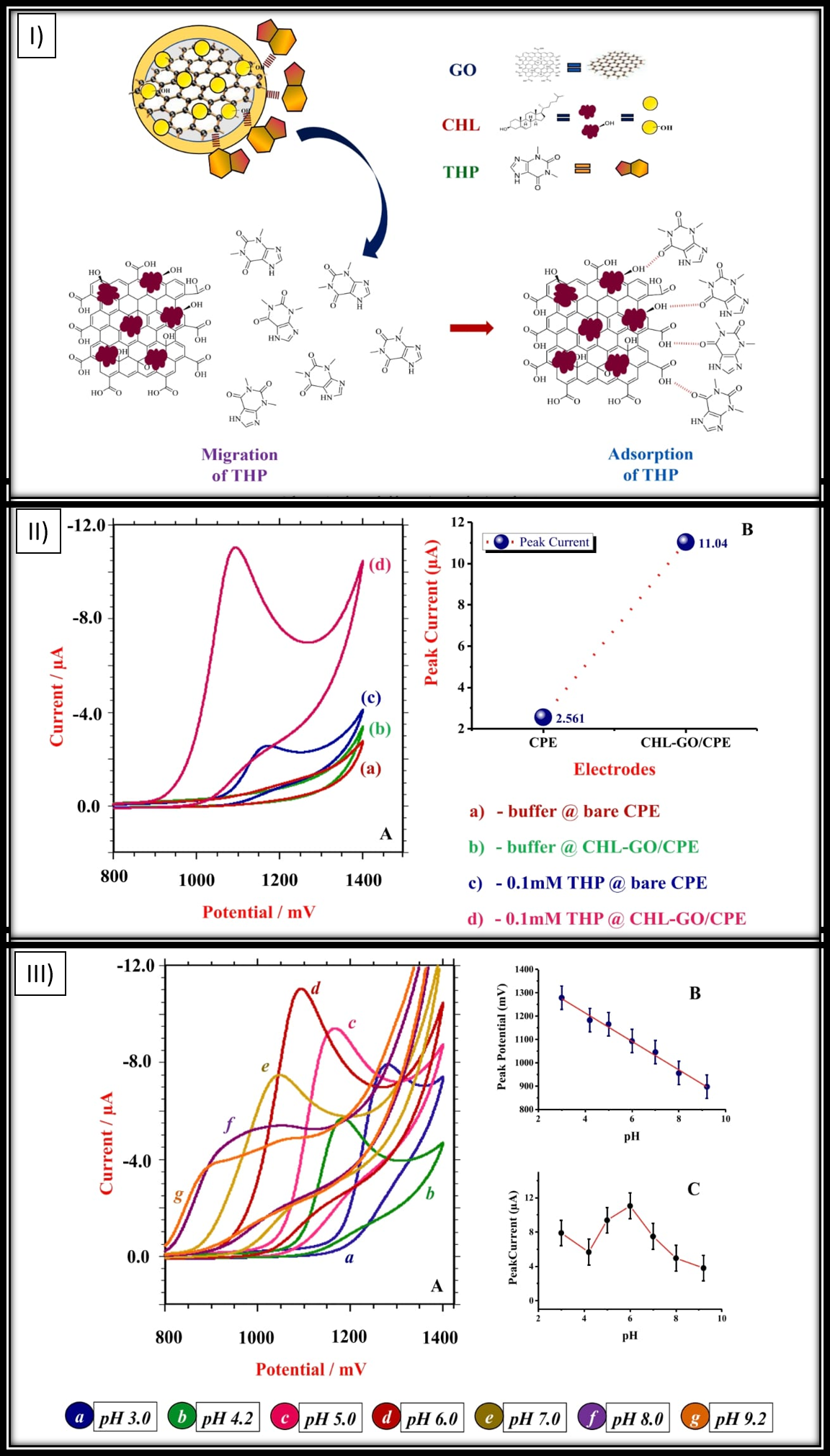 | Figure 2. I): The probable sensing mechanism of TP; II). A. Cyclic voltammograms of TP (0.1 mmol·L-1) in PBS of pH 6.0 and at a scan rate of 50 mV∙s-1, II). B. Deviation of Ip(μA) at CPE, and CHL-GO/CPE; III): A. CV curves of 0.1 mmol·L-1 TP in PBS with different pH values at CHL-GO/CPE; υ = 50 mV∙s-1 tacc = 0 s, III): B. pH influence on the Ep(V) of TP, C. Variation of Ip(µA) of TP with pH. Reproduced with permission of Ref. [ |