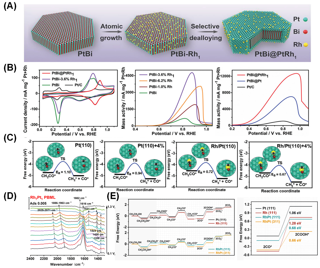 | Fig 11. (A) Schematic diagram of the preparation process of PtBi@PtRh1 nanosheets. (B) Ethanol electrooxidation performance test of PtBi@PtRh1. (C) C-C bond breaking energy distribution of CH2CO intermediates on different Pt(110) surfaces. Reproduced with permission of Ref. [ |
