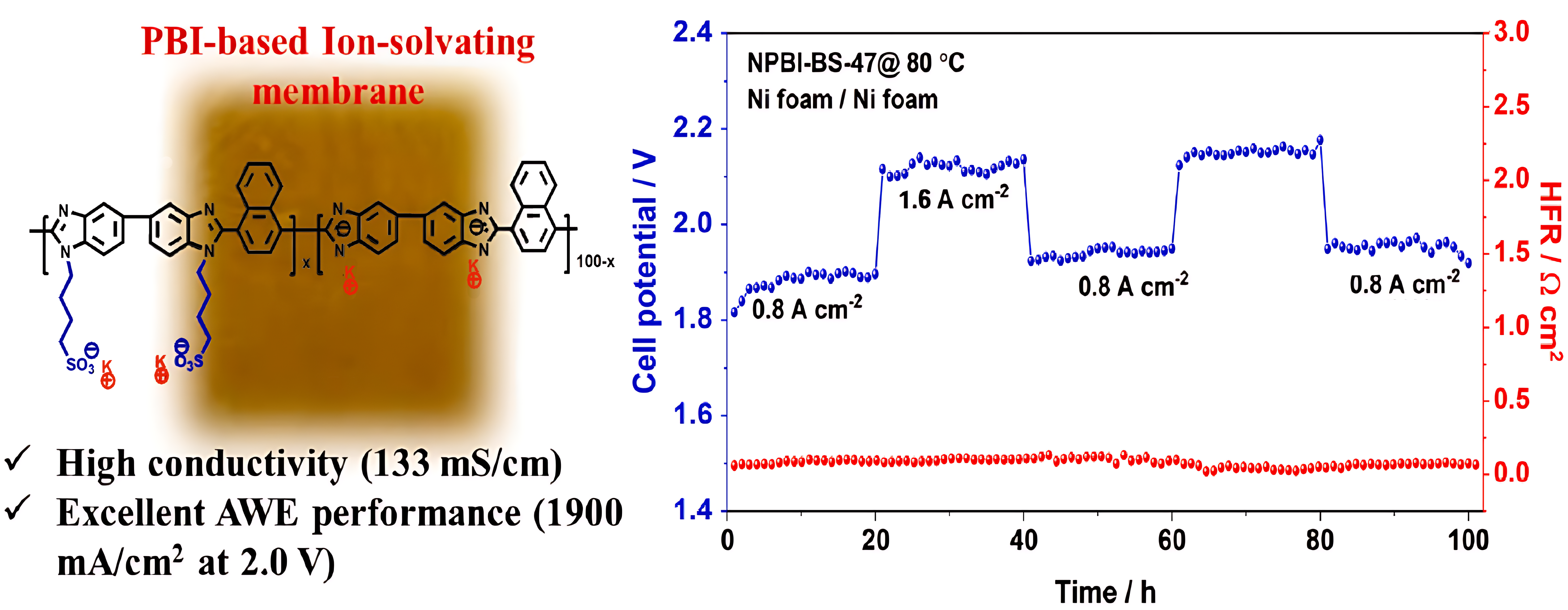 | Fig. 12. a. Chemical structure of NPBI-BS-X ISM; b. Durability of alkaline water electrolysis with NPBI-BS-47 membrane at 6 mol·L-1 KOH and 80 °C under dynamic operating modes. Reproduced with permission of Ref. [ |
