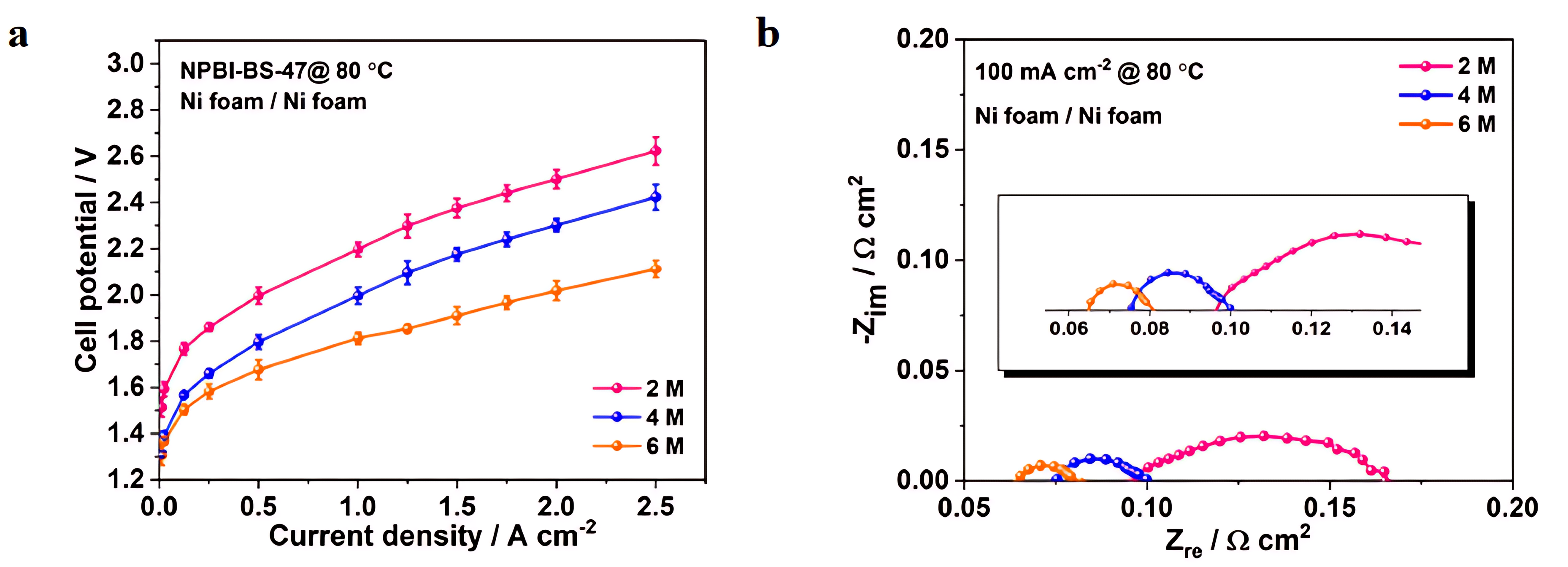 | Fig. 18. a. polarization curves for the alkaline water electrolysis with NPBI-BS-47 ISM at different concentrations of KOH; b. Nyquist plots of EIS spectra (0.1 A∙cm−2) of NPBI-BS-47 membrane at different concentrations of KOH. Reproduced with permission of Ref. [ |