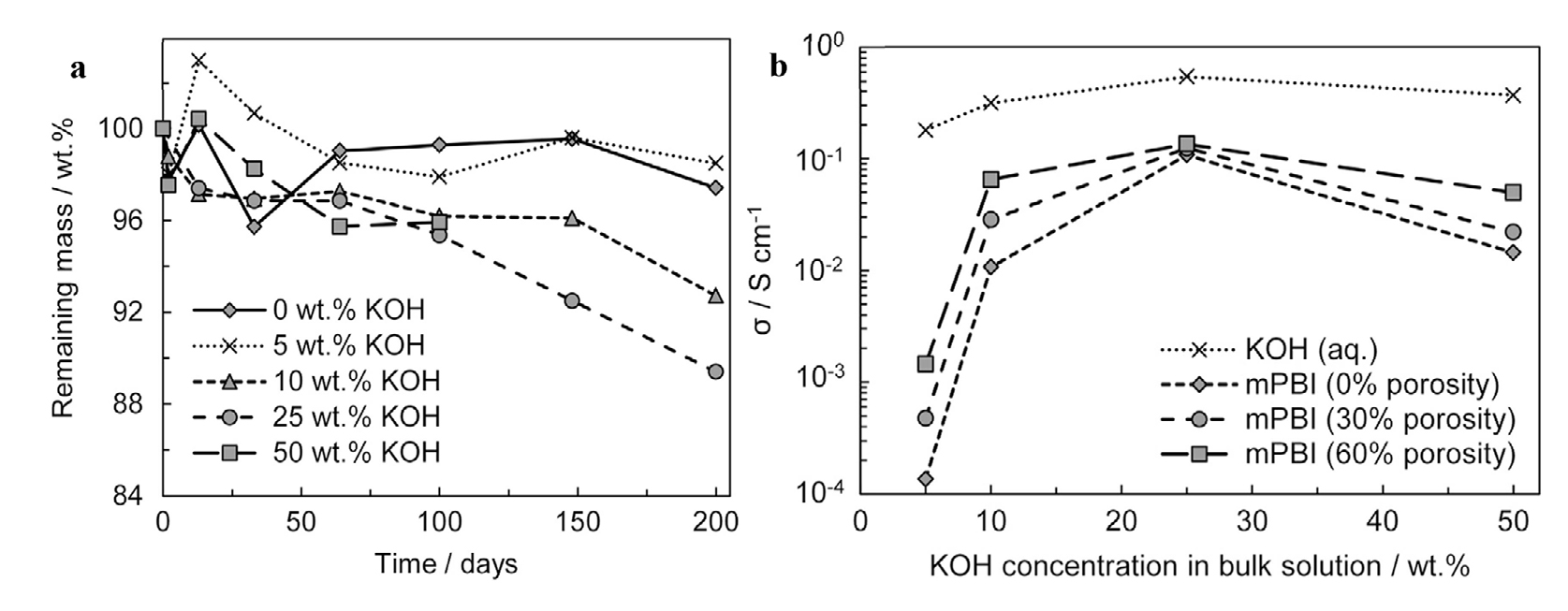 | Fig. 19. a. Membrane compositions after treatment in aqueous KOH of different concentrations at 88 oC; b. Remaining membrane mass after treatment in aqueous KOH of concentrations ranging from 0 to 50wt% at 88 oC for up to 200 days. Reproduced with permission of Ref. [ |