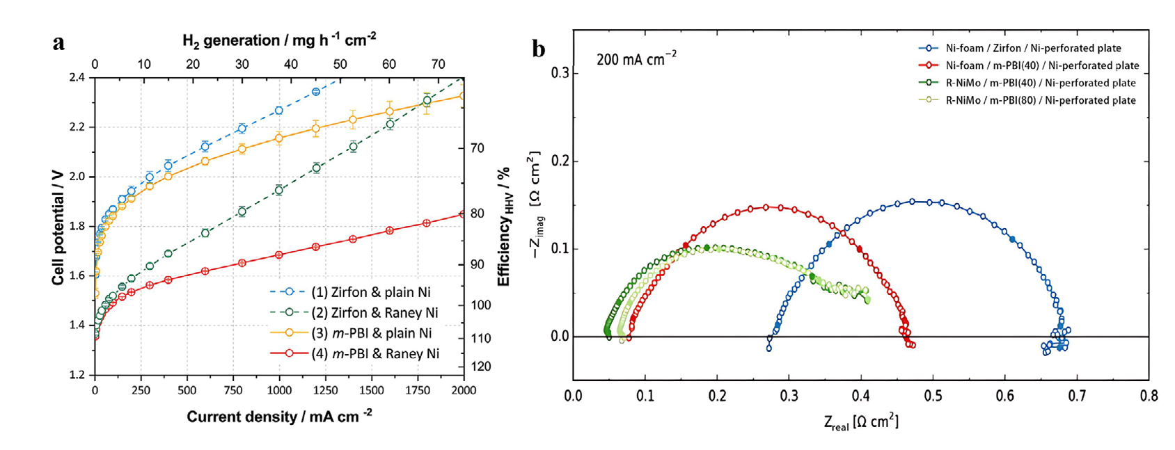 | Fig. 20. a. Electrochemical cell performance in 2wt.% KOH and 80 ℃; b. EIS of 4 different cells (cathode/separator/anode) at 200 mA∙cm-2. Reproduced with permission of Ref. [ |