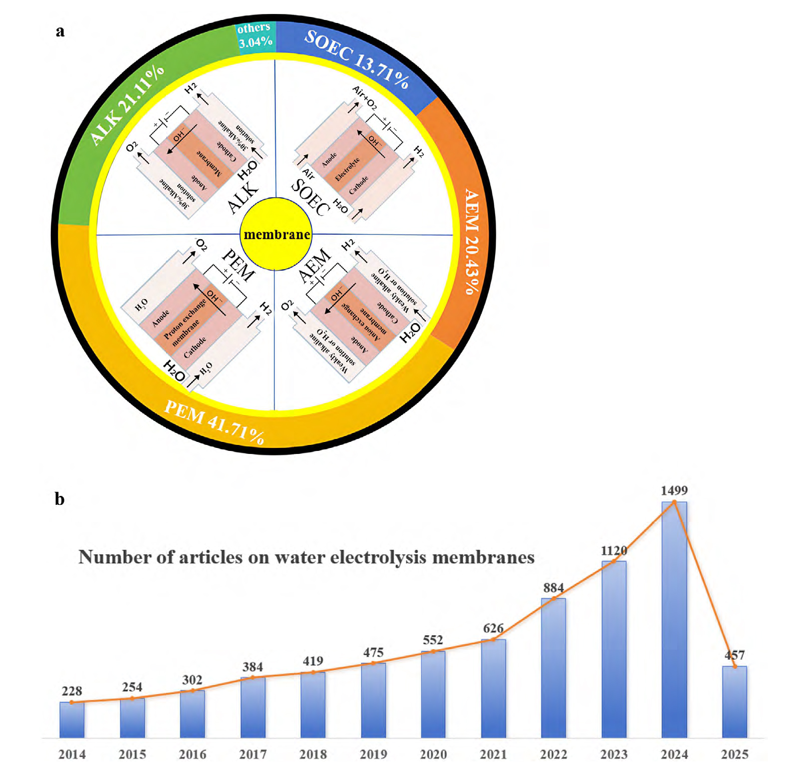 | Fig. 2. a. The proportion of scientific literature on membranes used in four types water electrolysis technologies for hydrogen production; b. The trend graph of the number of scientific literature on membrane technology used in electrolysis of water for hydrogen production in recent years. |
