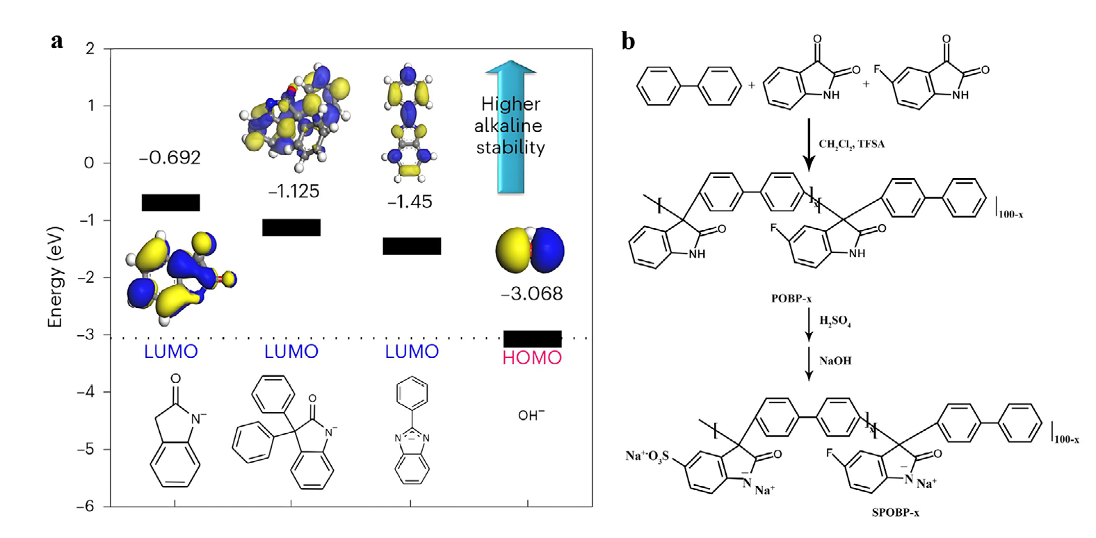 | Fig. 6. a. The calculated LUMO energies and isosurfaces of deprotonated model compounds and HOMO energy of OH-; higher the LUMO energy, higher the alkaline stability of the molecule. Reproduced with permission of Ref. [ |