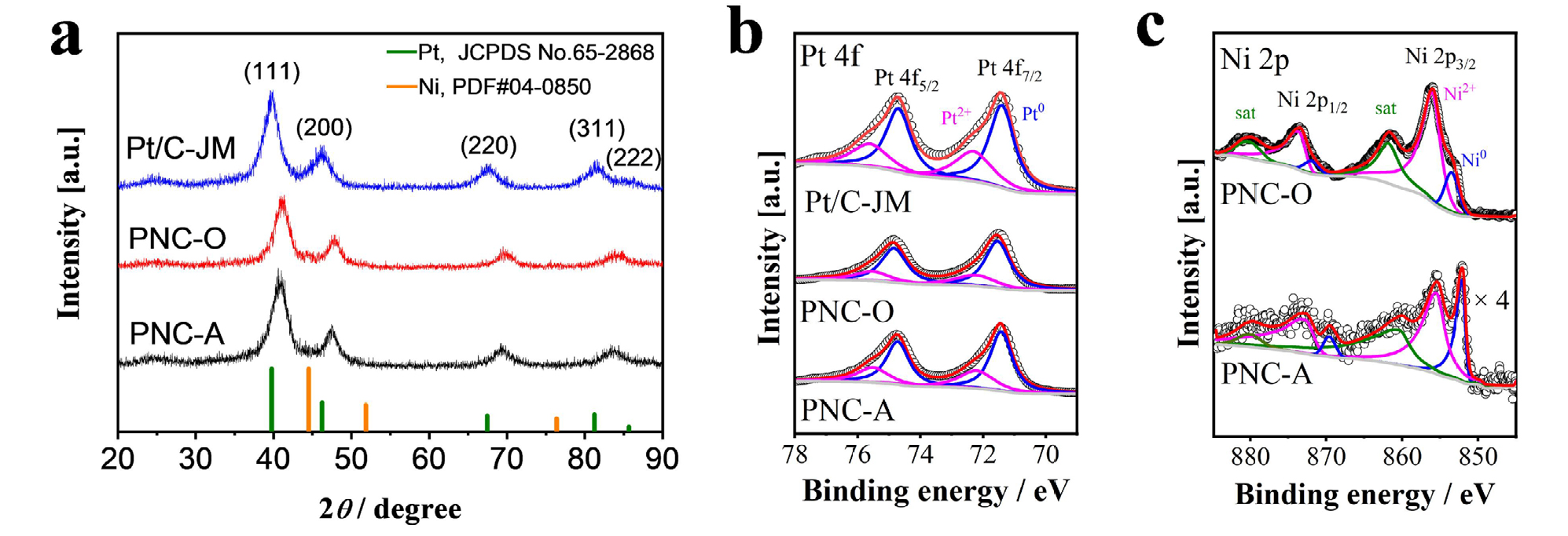 | Figure 2. (a) XRD patterns of PNC-A, PNC-O, and Pt/C-JM, XPS profiles and deconvolution of (b) Pt 4f and (c) Ni 2p of PNC-A, PNC-O and Pt/C-JM. |