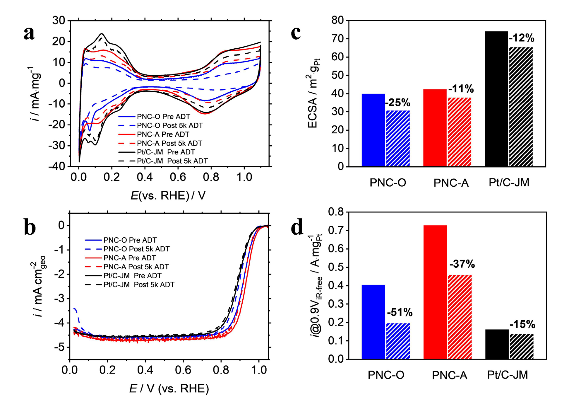 | Figure 3. (a) CV curves of PNC-A (—), PNC-O(—), Pt/C-JM(—) in N2 saturated 0.1 mol·L-1 HClO4 solution, — and --- stands for the curves of initial and after 5k ADT, respectively. (b) LSV curves of PNC-A, PNC-O, Pt/C-JM in O2 saturated 0.1 mol·L-1 HClO4 solution. (c) ECSA plots of three catalysts before and after ADT, (d) ORR mass activity plots of three catalysts before and after ADT. |