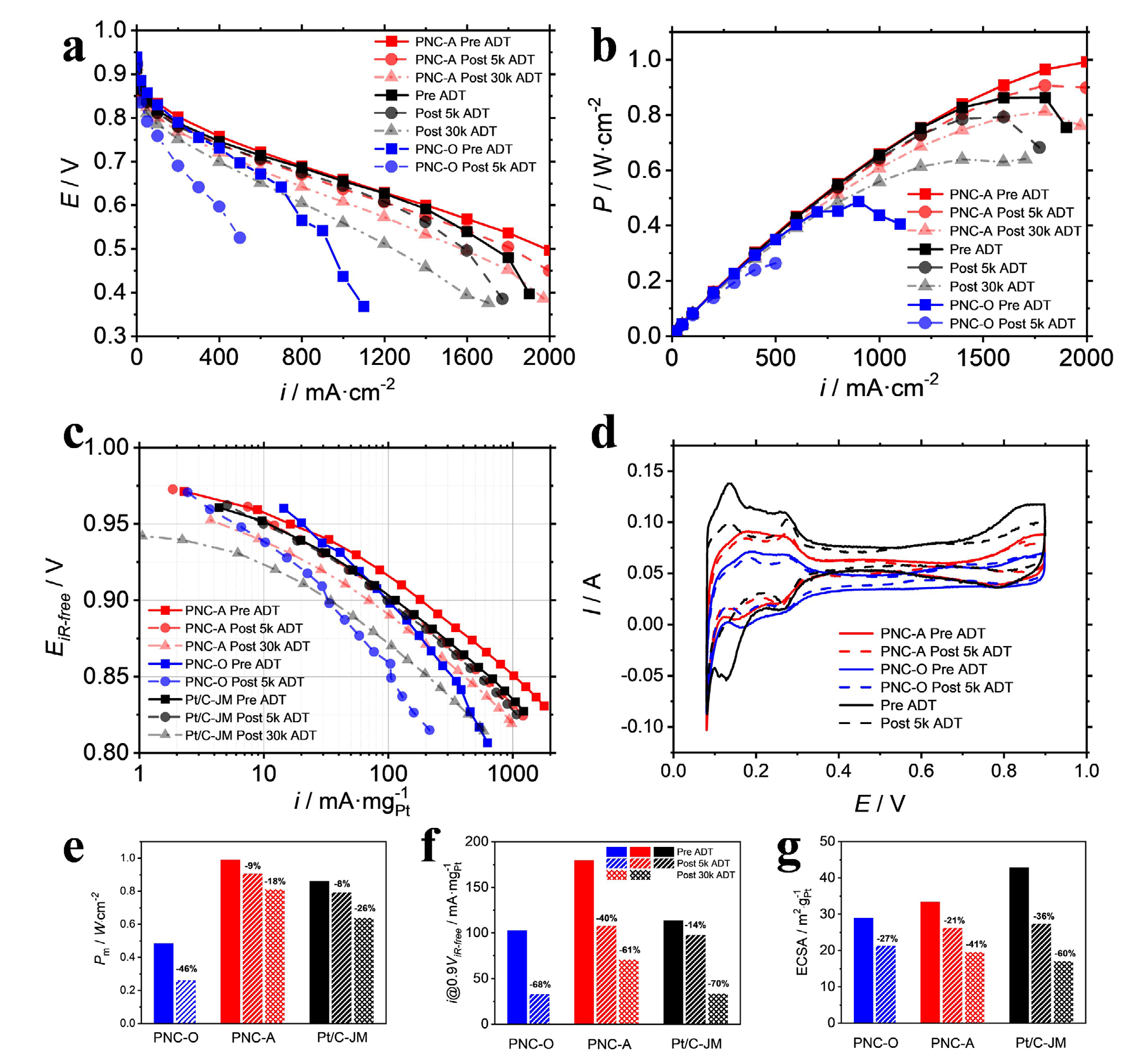 | Figure 4. (a) I-V and (b) I-P curves of MEA-PNC-A (—), MEA-PNC-O (—), and MEA-PC (—). The ■, ●, ▲symbols stand for the performances of initial, after 5k ADT, and after 30k ADT, respectively. (c) Tafel plots of MEA-PNC-A (—), MEA-PNC-O (—), and MEA-PC (—). (d) CV curves of MEA-PNC-A (—), MEA-PNC-O (—), and MEA-PC (—). (e) Pm, (f) ORR mass activity and (g) ECSA plots of MEA for MEA-PNC-A (—), MEA-PNC-O (—), and MEA-PC (—). |